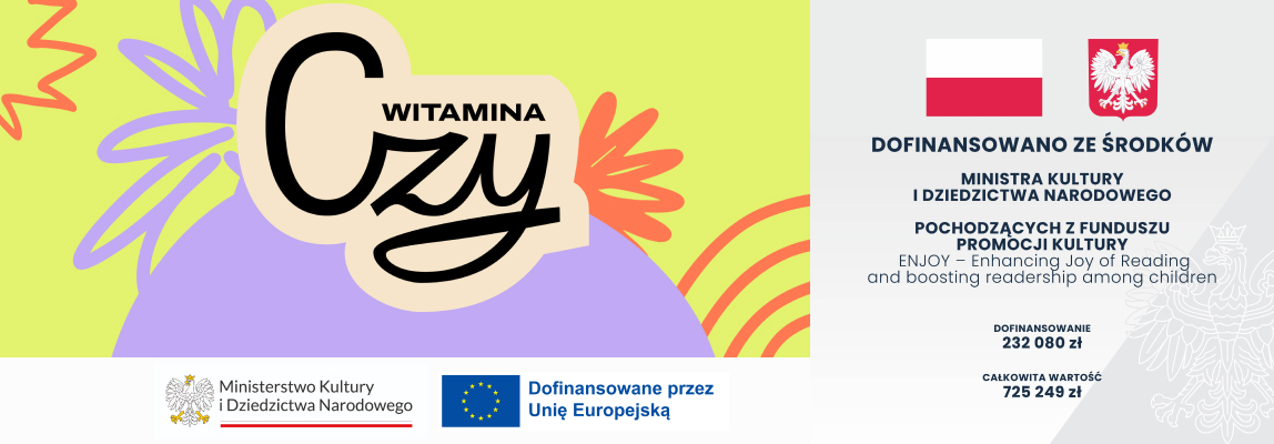 „WITAMINA CZY to nasza cegiełka dołączona do ogólnopolskich działań realizowanych przez instytucje kultury i biblioteki na rzecz promocji czytelnictwa wśród dzieci i młodzieży. W projekcie koncentrujemy się na czerpaniu przyjemności z czytania, która może płynąć zarówno z treści lektury, jak również z doświadczenia relacji, gdy książka czytana jest wspólnie z bliskimi, rodzicami, dziadkami, rodzeństwem czy kolegami i koleżankami”